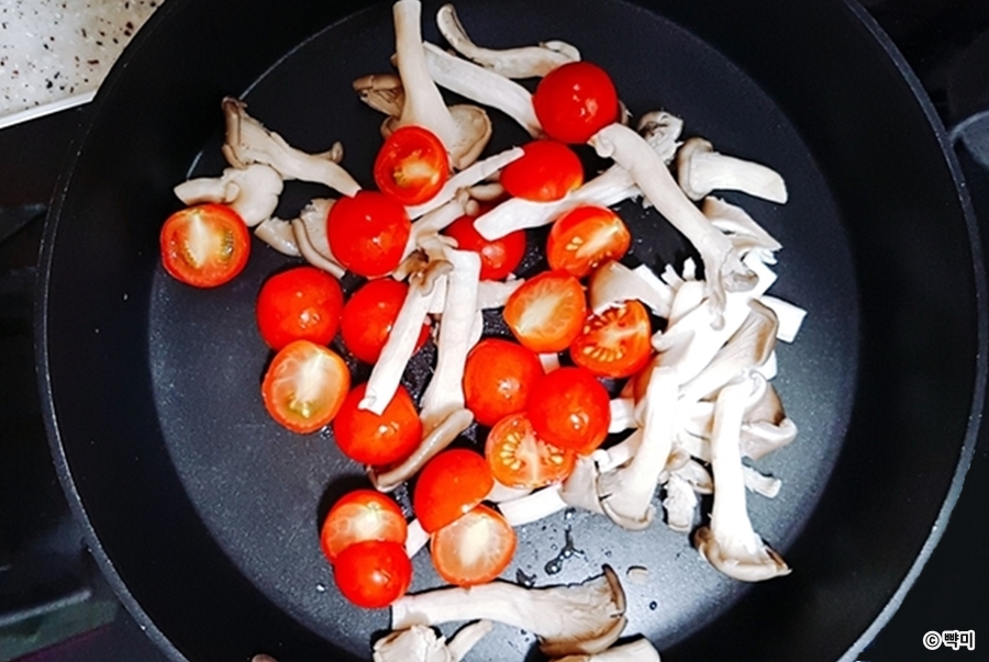 1. 세척한 버섯은 결대로 찢어주고 방울토마토는 반으로 잘라주세요.
