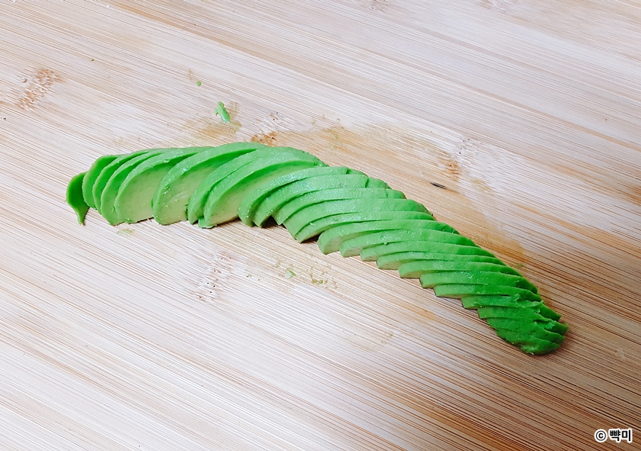 2. 아보카도는 반으로 자르고 씨를 제거한 뒤 껍질을 벗기고 얇게 썰어주세요.