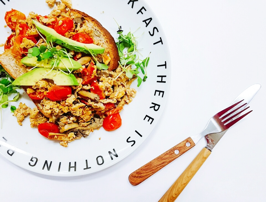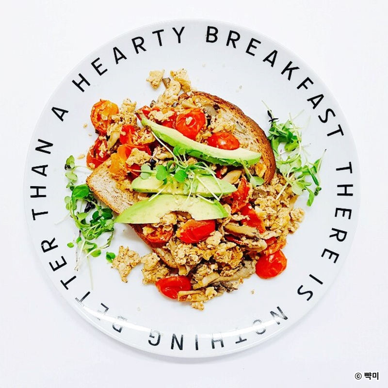 7. 그릇에 구운 통밀토스트를 담고 무설탕 땅콩버터를 바른 뒤 슬라이스 치즈를 올려주고 볶아놓은 토마토 버섯 계란 볶음을 올리고 썰어놓은 아보카도를 올려주고 어린 새싹 잎으로 데코해 주세요.