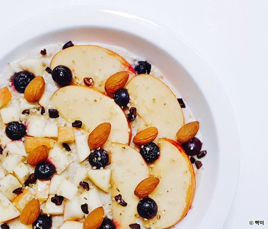 4. 가열한 오트밀 죽에 사과, 블루베리, 아몬드를 올리고 토핑으로 햄프 시드, 카카오 닙스를 뿌려주세요.
