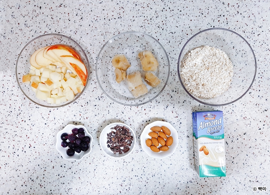 오트밀 30그램, 아몬드 브리즈 1팩(또는 무가당 두유), 바나나 1개, 사과 1/2, 블루베리 한 줌, 아몬드 한 줌, 햄프 시드 약간, 카카오 닙스 약간