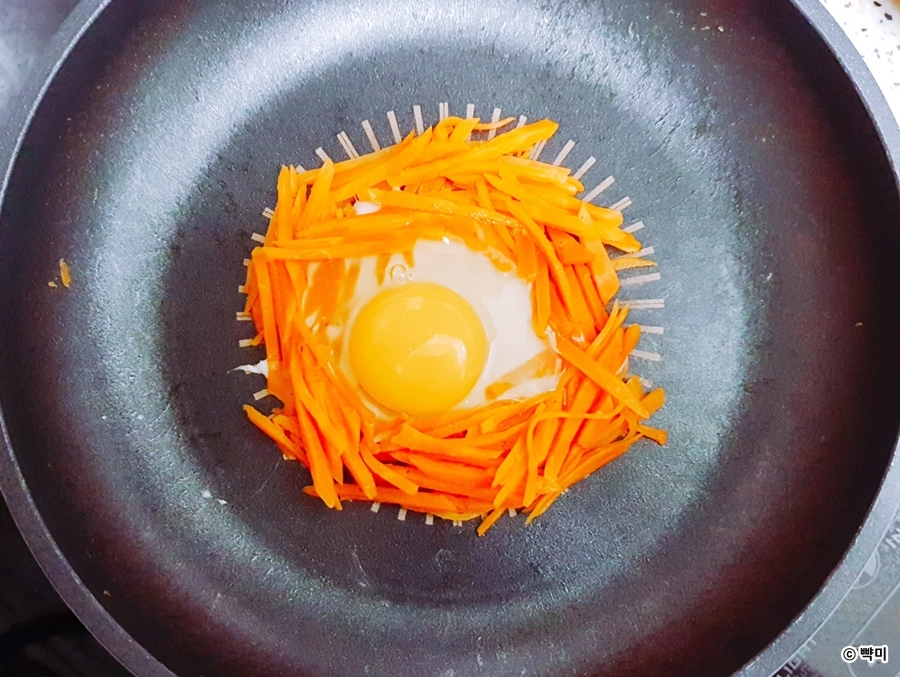 4. 계란을 당근둥지 안에 조심스럽게 담고 소금을 뿌려 반숙으로 익혀주세요.