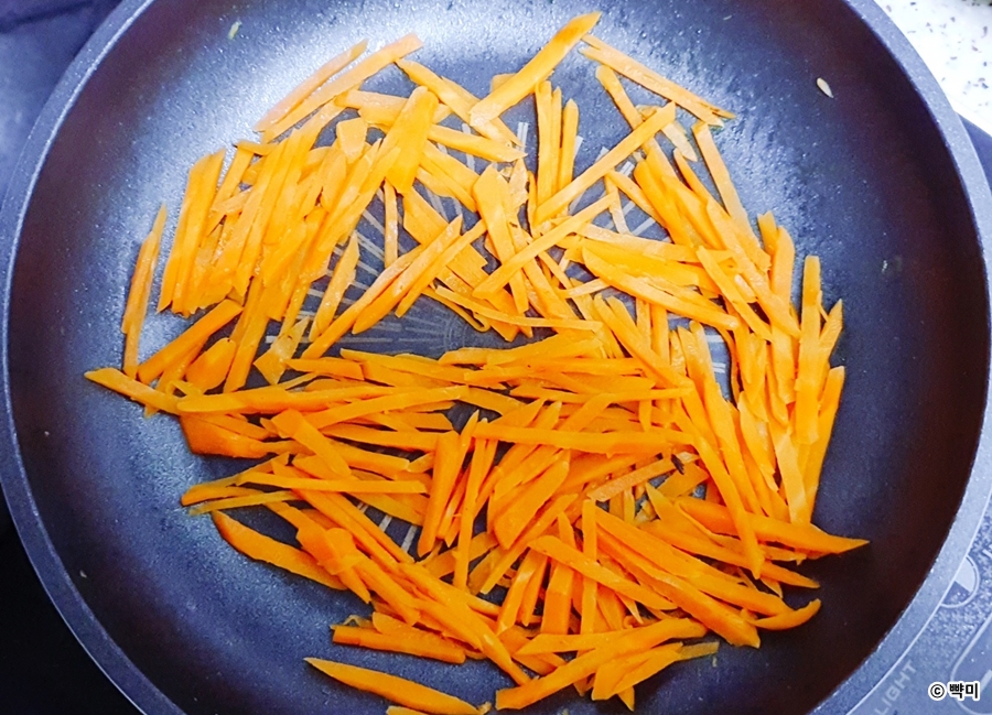 3. 당근은 길게 채 썬 후 예열한 팬에 코코넛 오일을 두르고 당근과 소금 한 꼬집을 넣고 센 불에서 볶아주세요. 당근을 볶다가 숨이 죽으면 가운데를 비워두고 동그랗게 둥지 모양을 만들어 주세요. ( 당근을 볶을 시간이 없다면 전자레인지로 2분~2분 30초 가열해 주세요. )