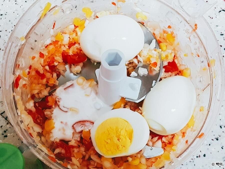 3. 야채 다지기에 잘라놓은 야채들을 넣고 잘게 다진 후 껍질을 벗겨놓은 삶은 계란을 넣고 다시 다져주세요.
