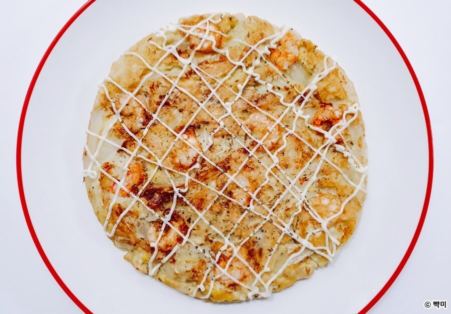 7. 완성한 두부 오코노미야끼를 접시에 담아주세요. 소형 지퍼백에 두부마요네즈를 넣고 지퍼팩 끝부분을 살짝 자른 후 오코노미야끼 위에 지그재그로 장식하며 뿌려주세요.