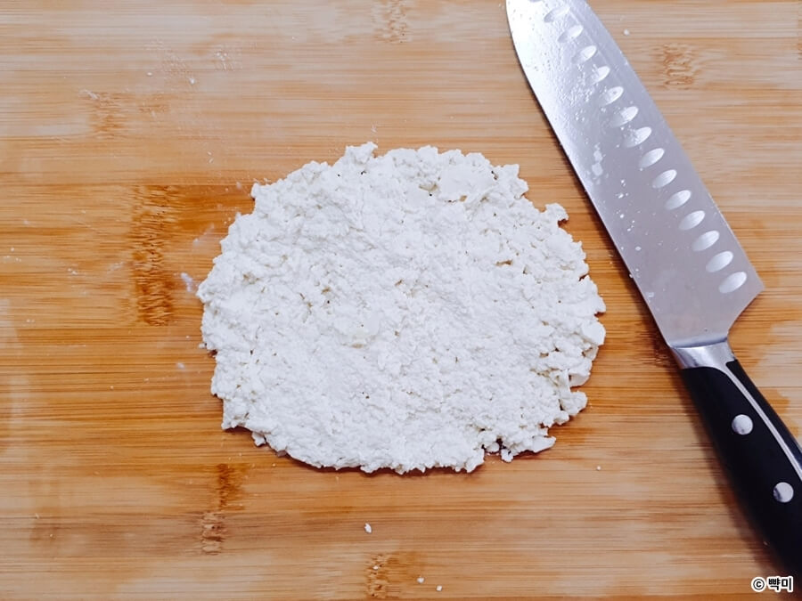 4. 두부는 물에 한번 헹궈 칼등으로 짓눌러 으깨주세요.