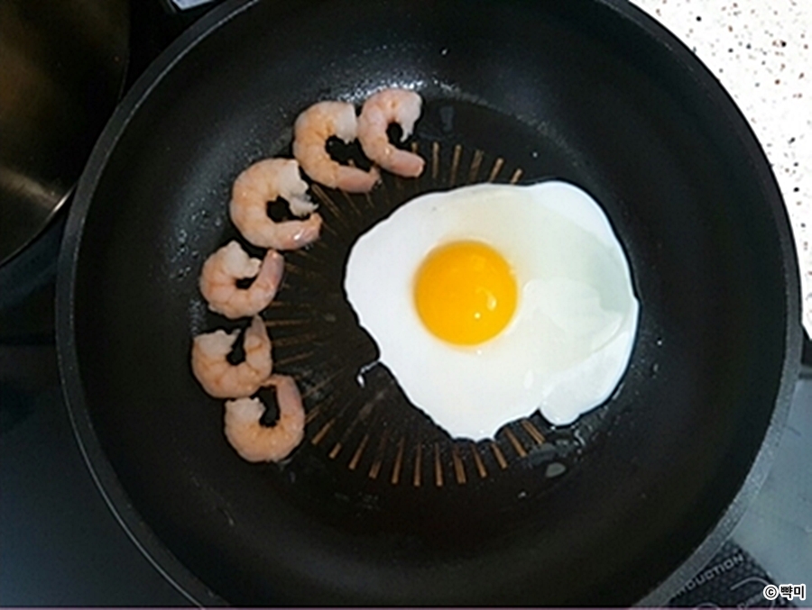 2. 달군팬에 코코넛 오일을 두르고 새우는 앞뒤로 구워주고 계란은 반숙으로 프라이를 만들어 주세요.