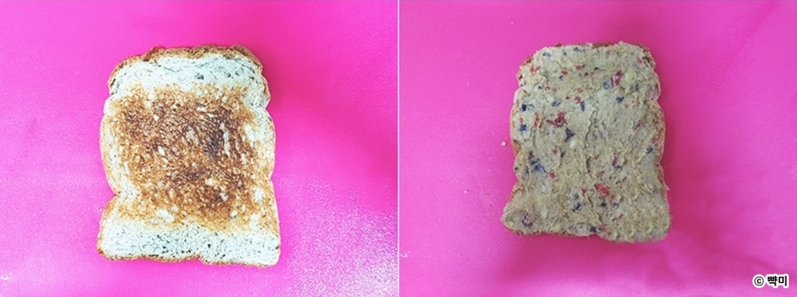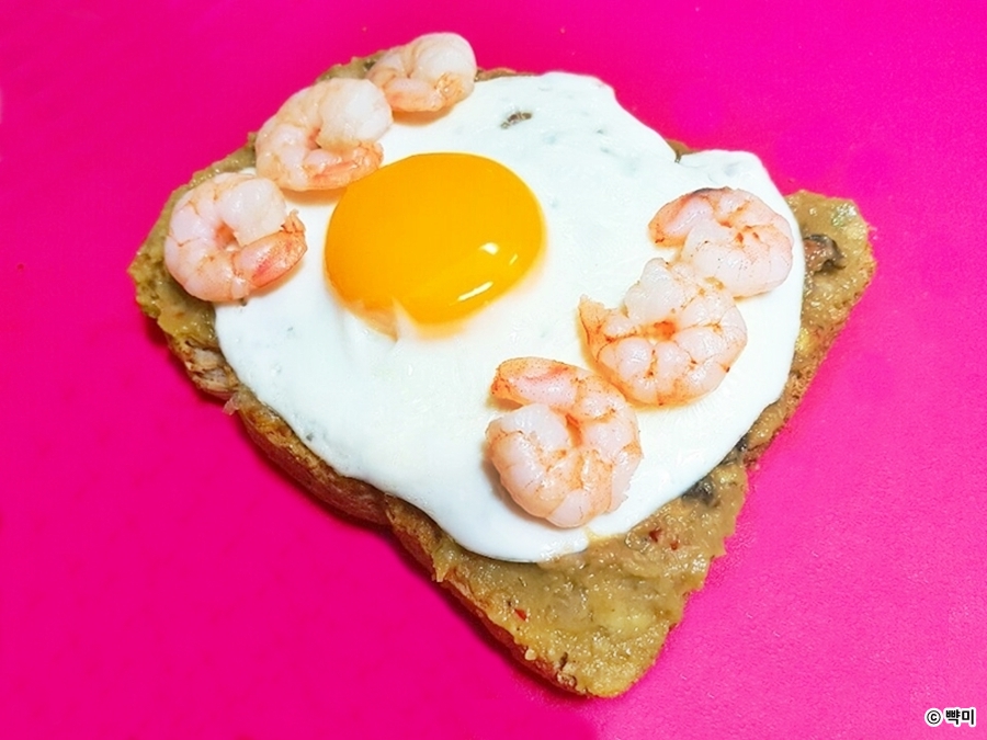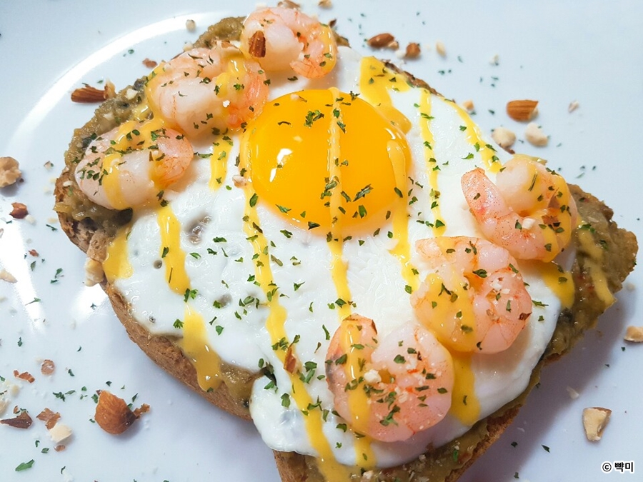 3. 통밀빵은 마른 팬에 앞 뒤로 노릇하게 굽고 아보카도 스프레드를 바른 뒤 새우, 달걀프라이를 올려주세요.