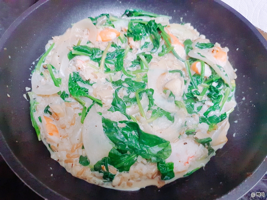 4. 시금치 순이 죽으면 무가당 두유와 밥을 넣고 섞어준 후 중불에서 2~3분간 졸여주세요.