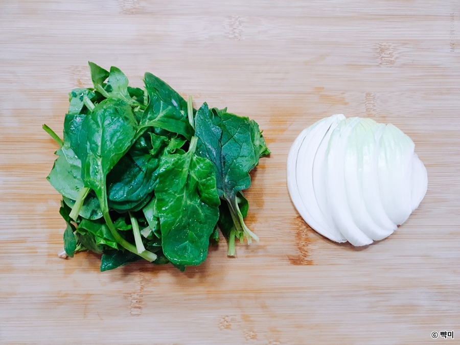 1. 시금치는 다듬어서 씻어준 후 체에 밭쳐 물기를 빼 준후 반으로 자르고, 양파는 채 썰어주세요.