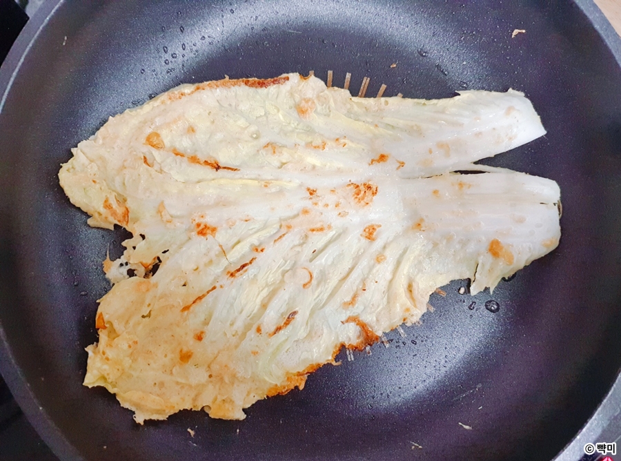 3. 달군 팬에 코코넛오일을 두르고 알배추에 반죽을 앞뒤로 골고루 묻혀 중간 불에서 노릇하게 구워주세요.