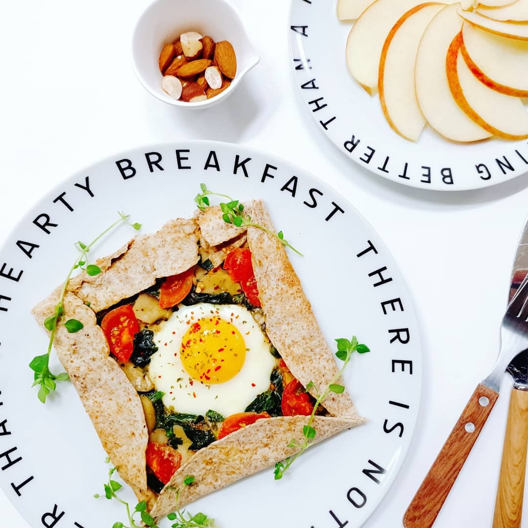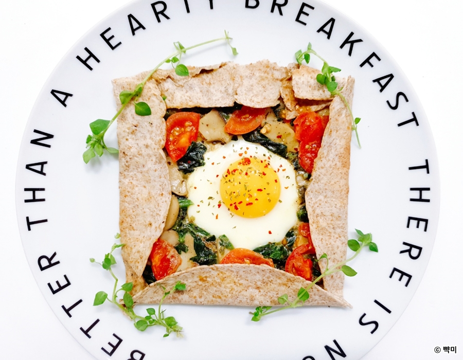 통밀또띠아 1장, 시금치 한 줌, 계란 1개, 토마토 1/3개, 새송이버섯 20그램, 소금 두 꼬집, 후춧가루 약간, 크러쉬드 레드페퍼 약간, 파슬리가루 약간, 코코넛 오일 1/2스푼