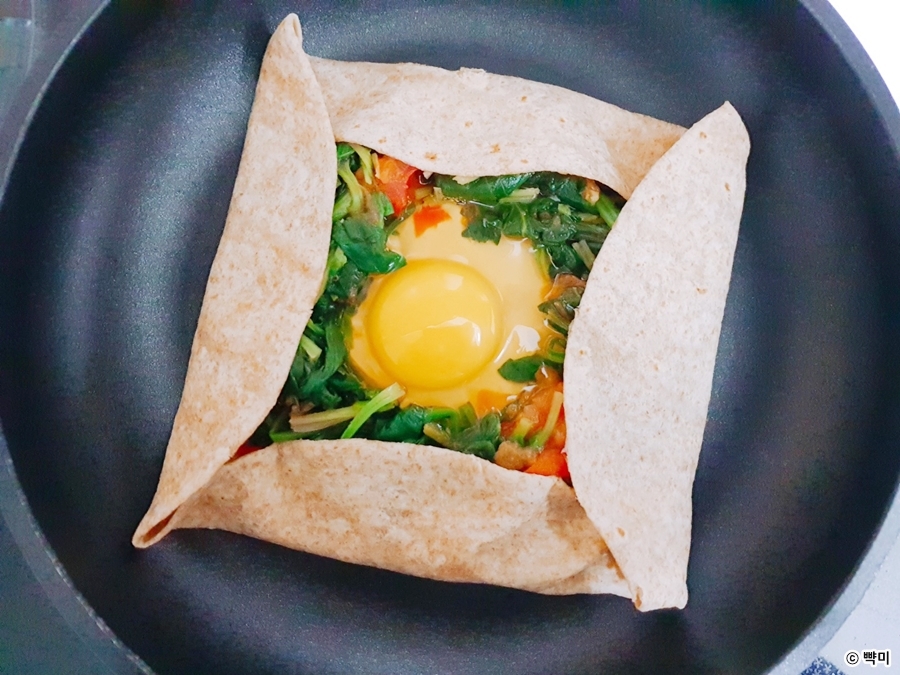 4. 가운데에 달걀을 깨트려 넣은 뒤 통밀또띠아를 위아래, 좌우로 접어준 후 팬의 뚜껑을 닫고 약불에서 기호에 따라 완숙, 반숙으로 익혀주세요. ( 계란 익는 시간을 줄이려면 계란프라이를 만들어 올려주세요. )