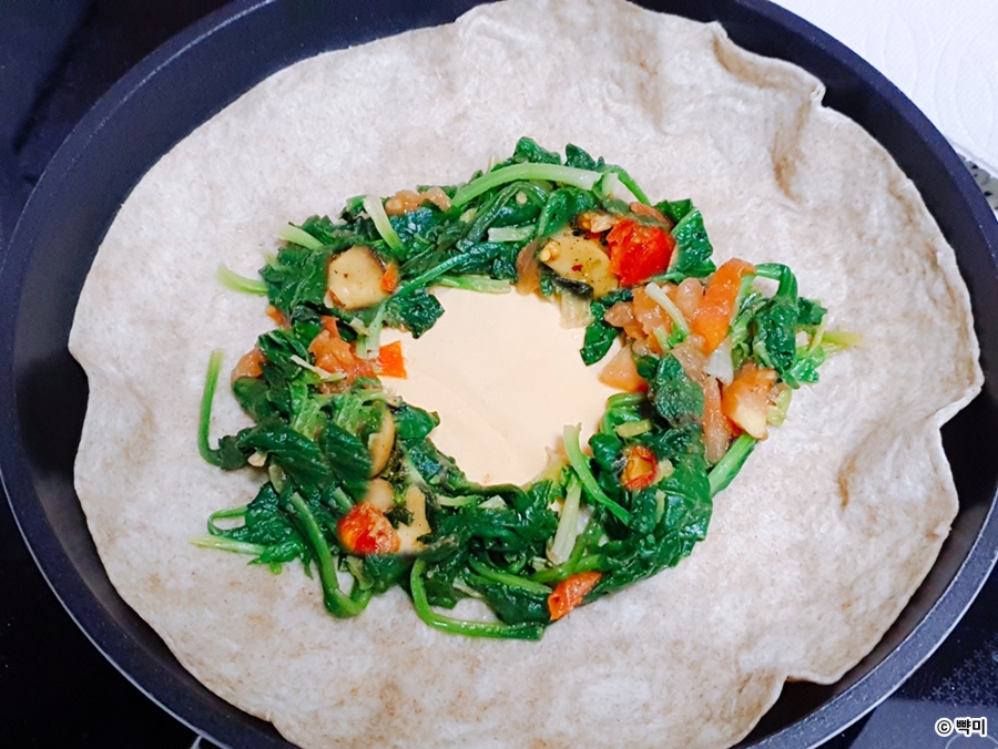 3. 마른팬에 약불로 통밀또띠아를 넣고 슬라이스 치즈를 올린 뒤 시금치 볶음을 도넛 모양으로 쌓아주세요.