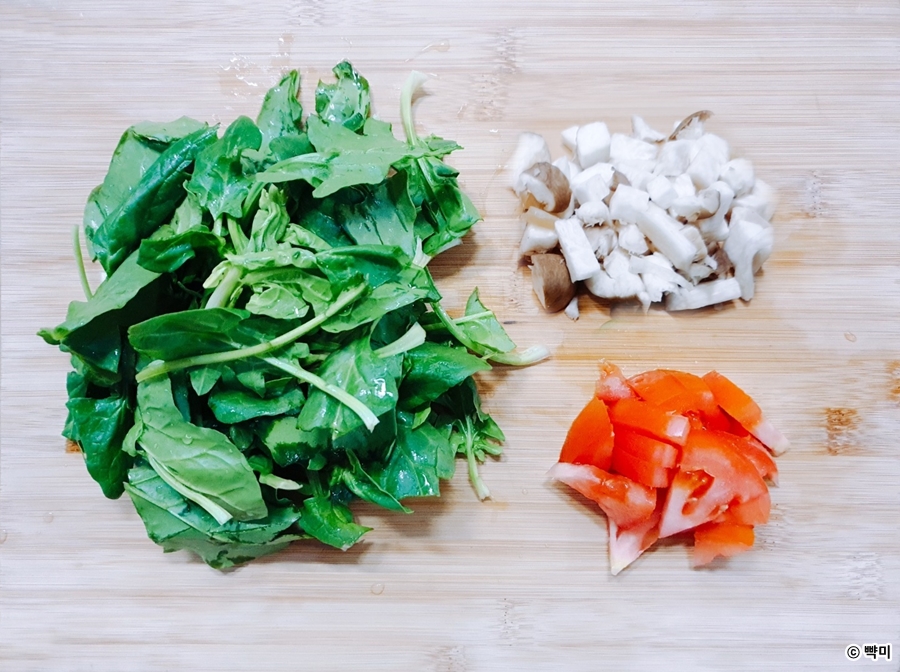 1. 시금치는 손질후 씻어서 체에 밭쳐 물기를 빼 준후 반으로 잘라주세요. 새송이버섯은 밑동을 자르고 씻어준 후 작게 썰고 토마토도 적당한 크기로 썰어주세요.