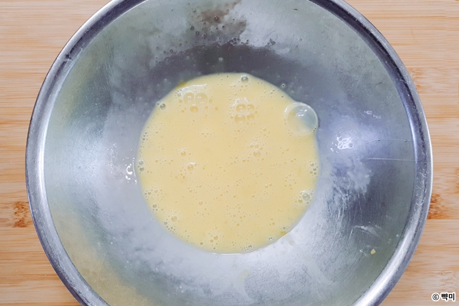 3. 넒은 그릇에 계란을 풀어 계란물을 만들어 주세요.