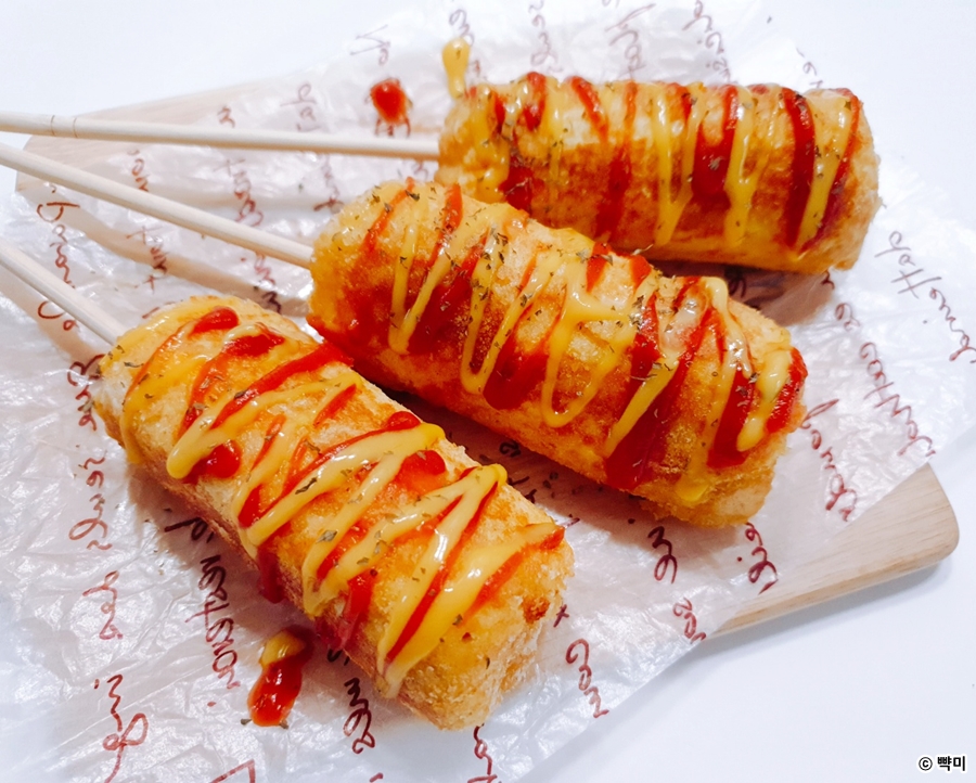 식빵과 소세지 치즈까지 냉장고에 있는 재료들을 활용해서 먹음직스럽게 완성된 식빵 핫도그에요~