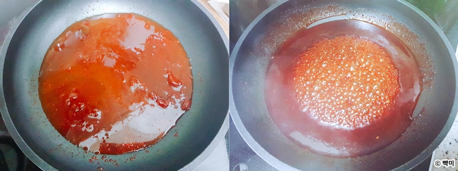 프라이팬에 고추장, 고운 고춧가루, 물엿, 황설탕, 물을 넣고 잘 저어 설탕이 녹을 정도까지 끓여주세요.