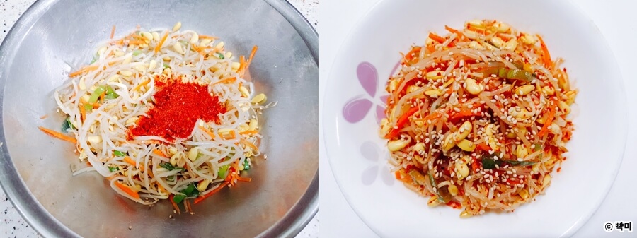 4. 마지막으로 고춧가루를 넣고 무치면 빨간 콩나물 무침, 고춧가루 콩나물 무침이 됩니다.