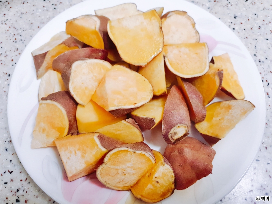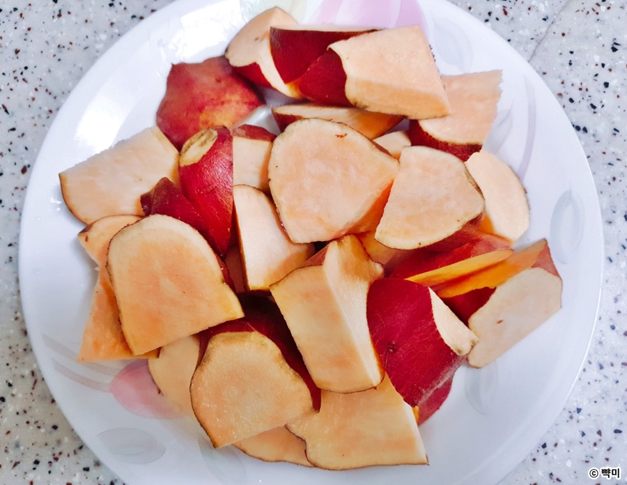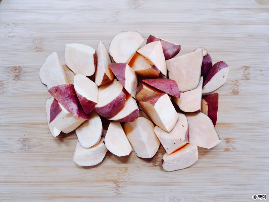 1. 고구마는 깨끗이 세척 후, 한 입 크기로 썰어주세요. ( 껍질은 기호에 따라 벗겨주거나 그래도 사용해 주세요. )