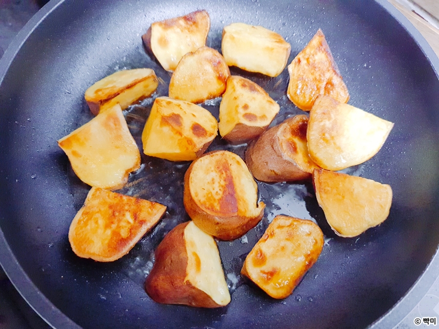 3. 달군 팬에 코코넛 오일을 담고 녹인 뒤 끓기 시작하면 익힌 고구마를 넣고 앞 뒤로 노릇하게 구워 키친타월을 깐 그릇에 담아 주세요.
