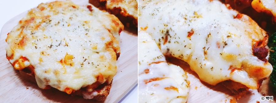 오븐에 갓 구워서 완성된 식빵 피자 비주얼 보소!! 겉은 바삭하고 속은 부드럽고 촉촉한 식감으로 고소한 치즈가 폭탄처럼 흘러내려서 맛이 없을 수가 없는 치즈 피자 토스트, 확실히 오븐에 구웠더니 겉바속촉으로 더욱 맛있게 먹을 수 있었던 것 같습니다. 식빵 피자 만들기 초간단 레시피 찾는다면 오늘 올린 레시피로 만들어 보셔도 좋을것 같습니다.
