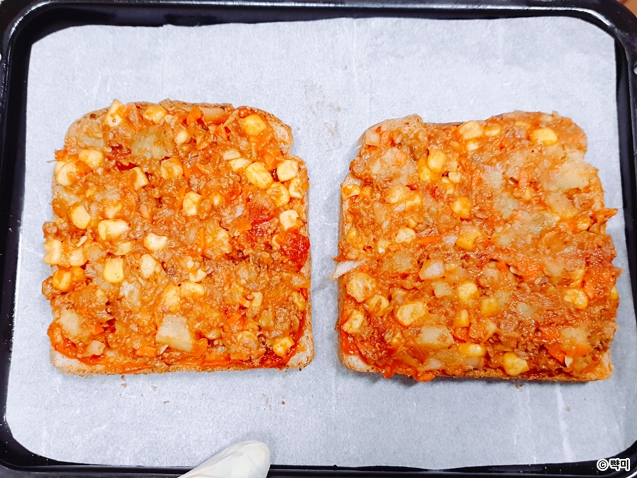 통밀식빵 1장, 피자치즈 80그램, 토마토소스 2큰술, 캔 옥수수 30그램, 양파 2/1개, 당근 1/4개, 찐 고구마 30그램, 구운 소고기 30그램, 파슬리 가루 약간
