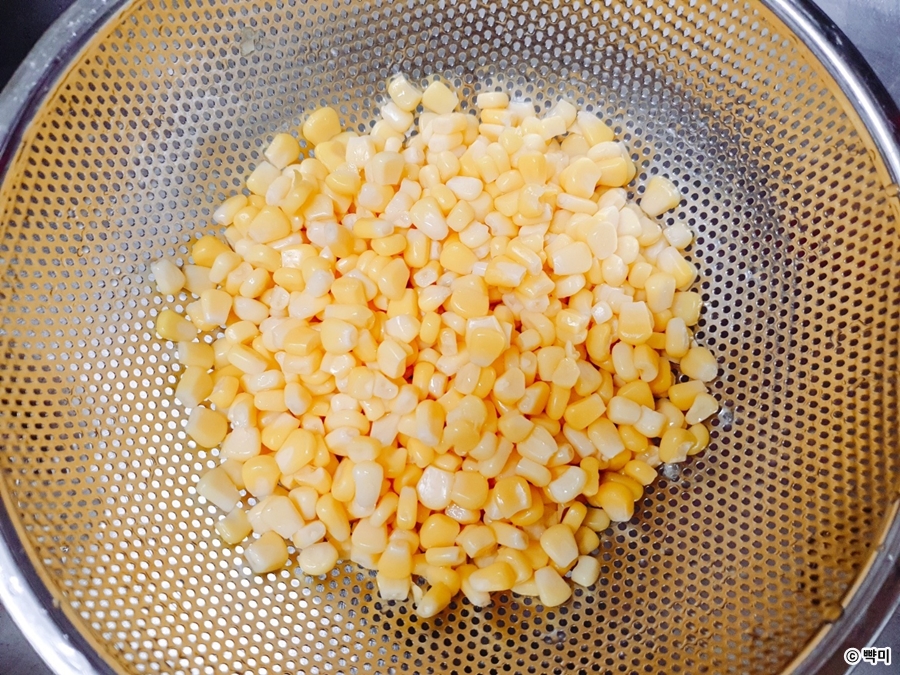 2. 캔 옥수수알은 찬물에 여러 번 헹구고 체에 밭쳐서 물기를 빼 주세요.