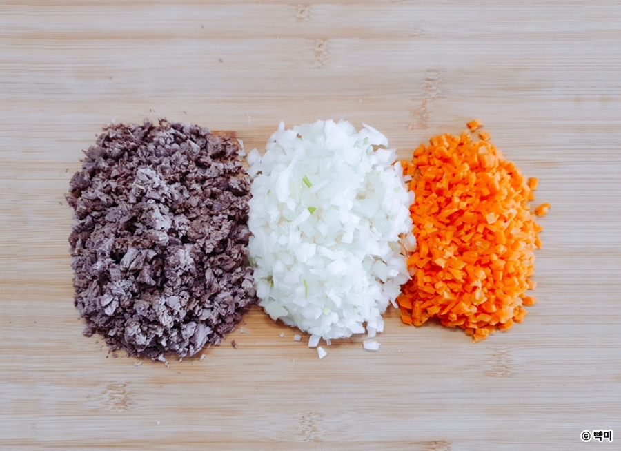 1. 양파, 당근, 구운 소고기는 잘게 다져주고 삶은 고구마는 사방 1센티미터로 잘라주세요. ( 볶음밥 재료가 남아서 사용했습니다. 피자 만들기 재료는 기호에 맞게 선택해서 넣어주세요. )