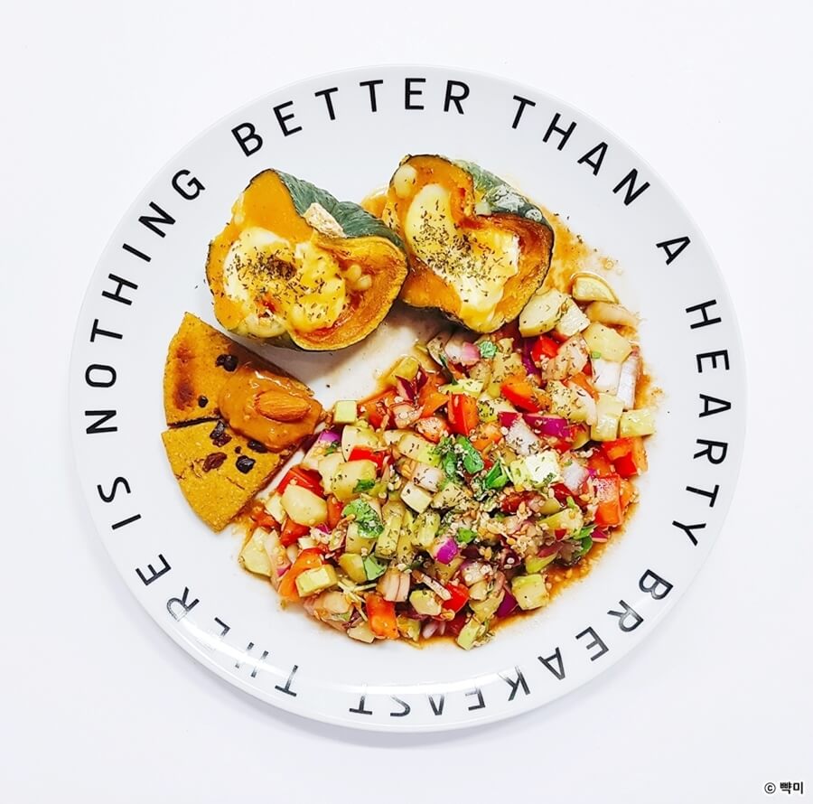 3. 완성된 발사믹 샐러드를 접시에 담고 단호박과 스콘을 곁들이고 파슬리가루를 뿌려주세요.
