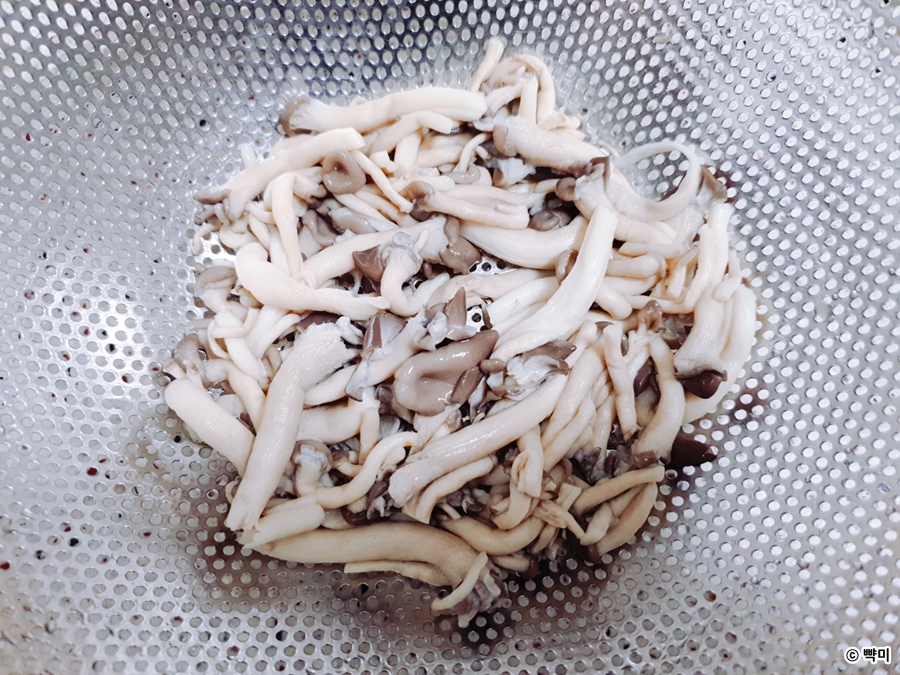 4. 데친 느타리버섯은 찬물에 헹군 뒤 물기를 꼭 짜 주세요.