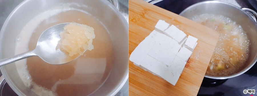 5. 된장 물이 끓어오르면 다진 마늘, 두부를 넣어 주세요.
