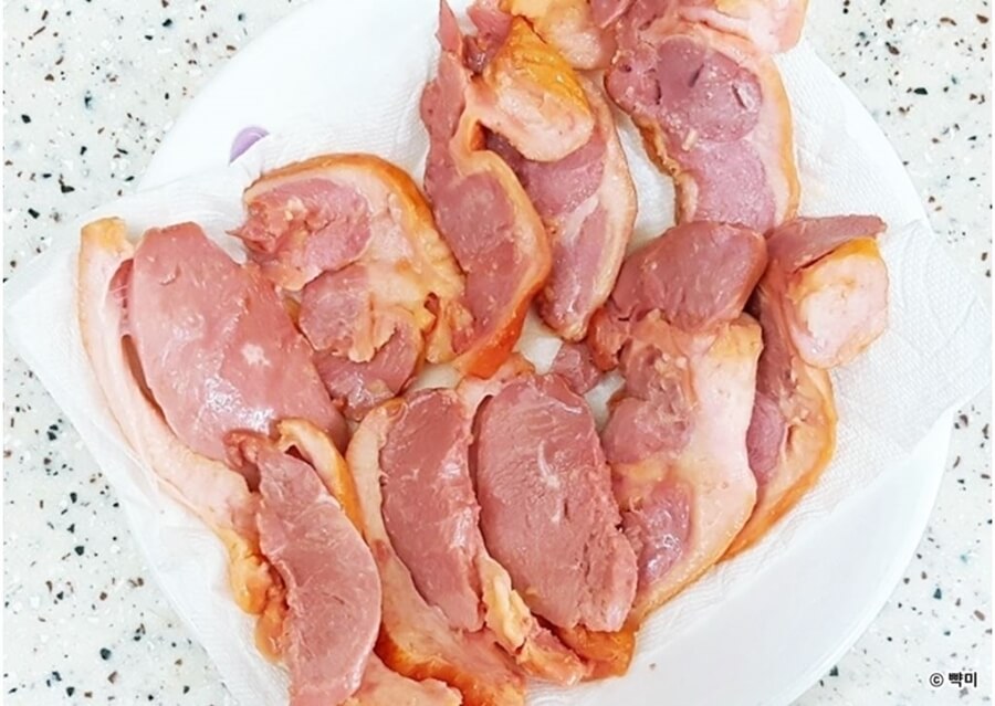 2. 접시에 키친타월을 깔고 훈제오리를 올린 뒤 전자레인지에 넣고 1분간 가열한 후 기름기를 제거하고 한 입 크기로 썰어주세요.