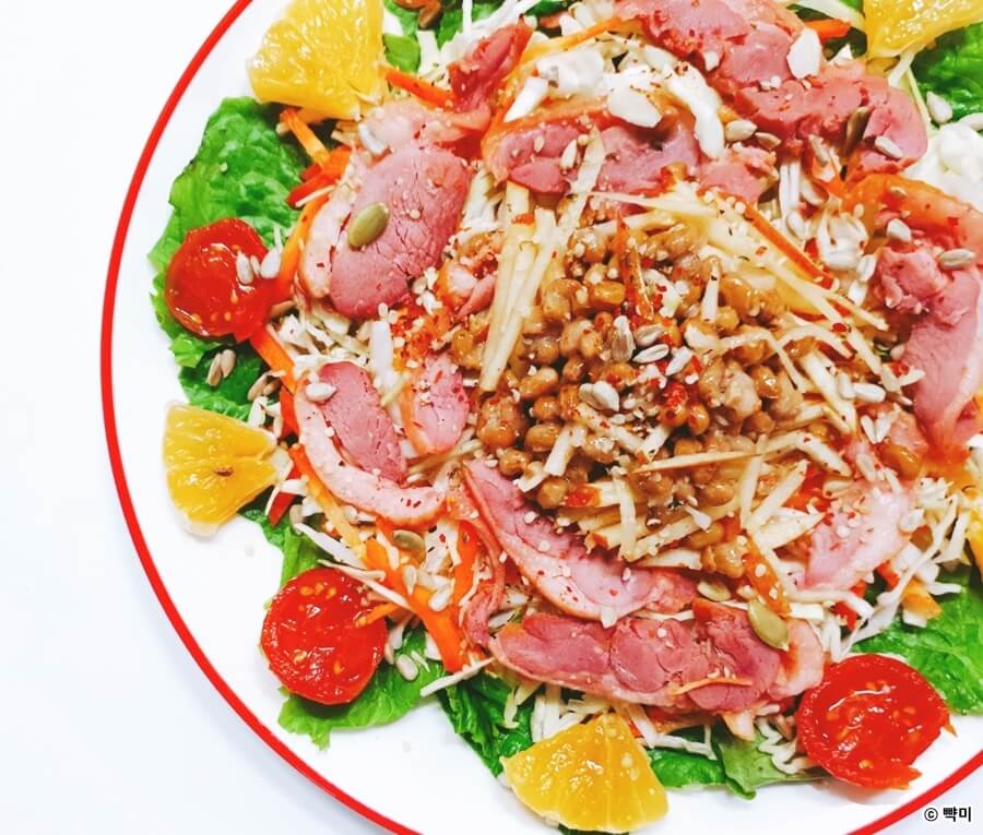 안녕하세요! 건강한 라이프스타일을 지향하는 요리하는 헬시어터 뺙미입니다. 오늘의 다이어트 레시피는 단백질은 물론 건강한 지방으로 이루어진 훈제오리를 활용한 요리입니다. 간단하게 만들 수 있는 다이어트 저녁 식단으로 훈제오리에 새콤달콤한 사과를 썰어 넣고 나또를 얹어서 평상시 나또를 먹기가 부담스러운 사람도 맛있게 먹을 수 있는 훈제오리 사과샐러드 만들기로 올려봅니다.