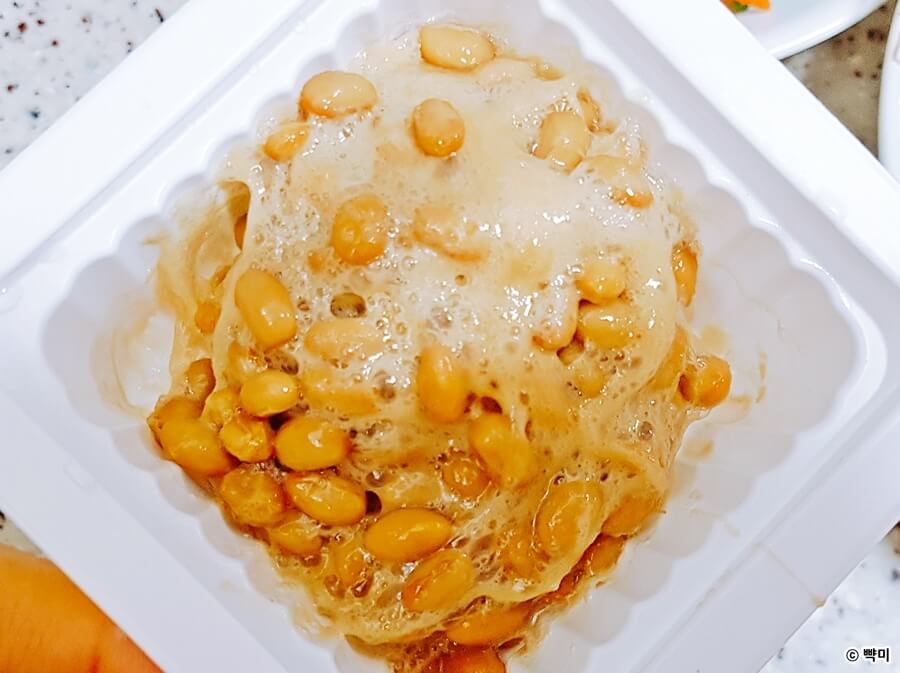 3. 나또는 젓가락으로 잘 휘저은 후 낫토 팩 안에 든 겨자, 간장을 넣고 버무려 주세요.