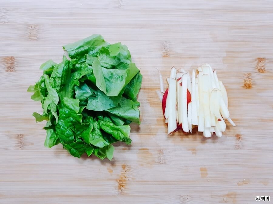 1. 상추는 흐르는 물에 씻어 손으로 찢거나 썰어주고 양배추, 당근, 사과는 길게 채 썰고 방울토마토는 반으로 잘라주세요.
