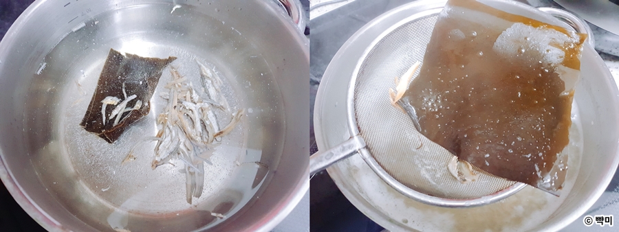 1. 냄비에 물 2리터, 국물멸치, 다시마를 넣고 중불로 끓여주세요. 육수가 끓기 시작하면 약불로 줄이고 30분 정도 끓인 후 불을 끄고 건더기를 건져주세요.