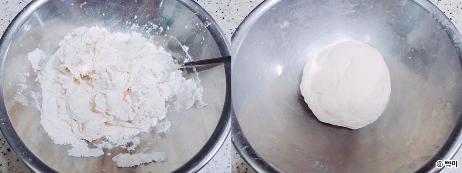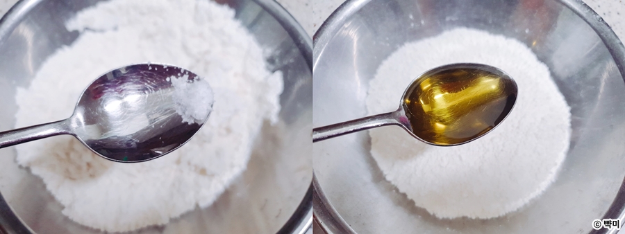2. 볼에 밀가루, 소금, 식용유 1스푼을 넣고 물은 2/3 종이컵을 나누어 넣으면서 숟가락으로 저어 섞다가 반죽이 뭉쳐지면 손으로 반죽해 주세요.