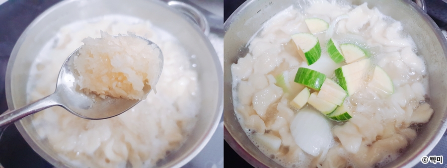 6. 수제비가 끓어오르면 간 마늘, 양파, 애호박, 후춧가루를 약간 넣고 바글바글 끓여주세요.