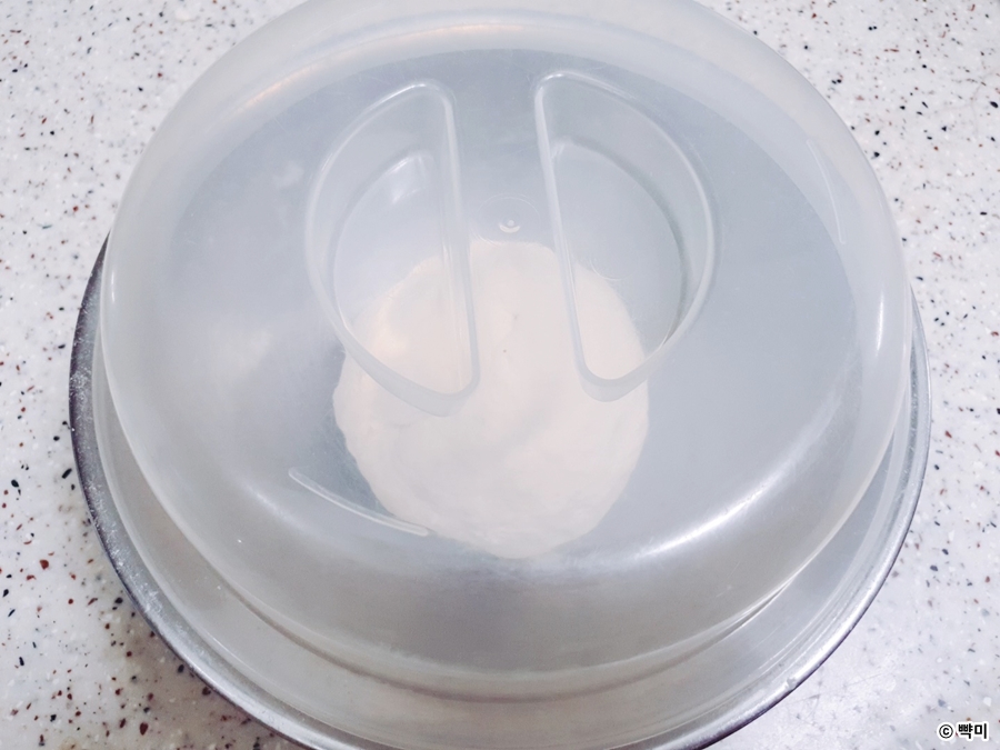 3. 완성한 반죽은 볼에 넣은 상태로 뚜껑을 닫아 30분간 숙성시켜 주세요. (비닐에 담아 공기가 들어가지 않도록 묶은 후 냉장고에 10분 동안 넣었다가 꺼내서 사용하는 방법도 있습니다.)