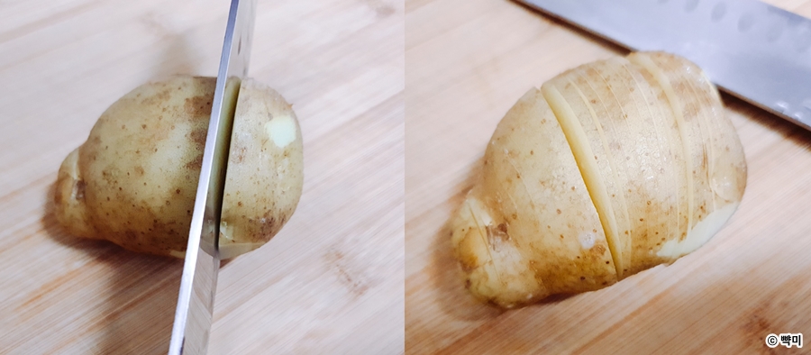 2. 감자의 맨 아랫부분 1~2센티미터 정도만 남기고 칼로 감자를 얇게 잘라주세요. (감자 아랫부분에 젓가락을 양쪽으로 두고 고정시킨 뒤 하는 방법도 있더라고요...^^ 근데, 그냥 잡고 잘라도 잘 잘라지네요..)