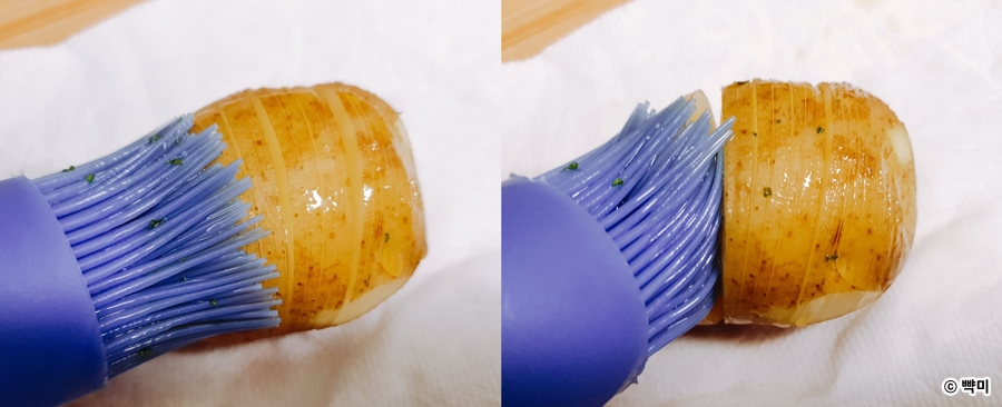 6. 붓으로 녹인버터를 감자 사이사이에 골고루 발라주세요.