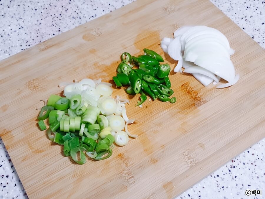1. 양파는 적당한 두께로 채 썰고 대파, 청양고추도 송송 썰어주세요.