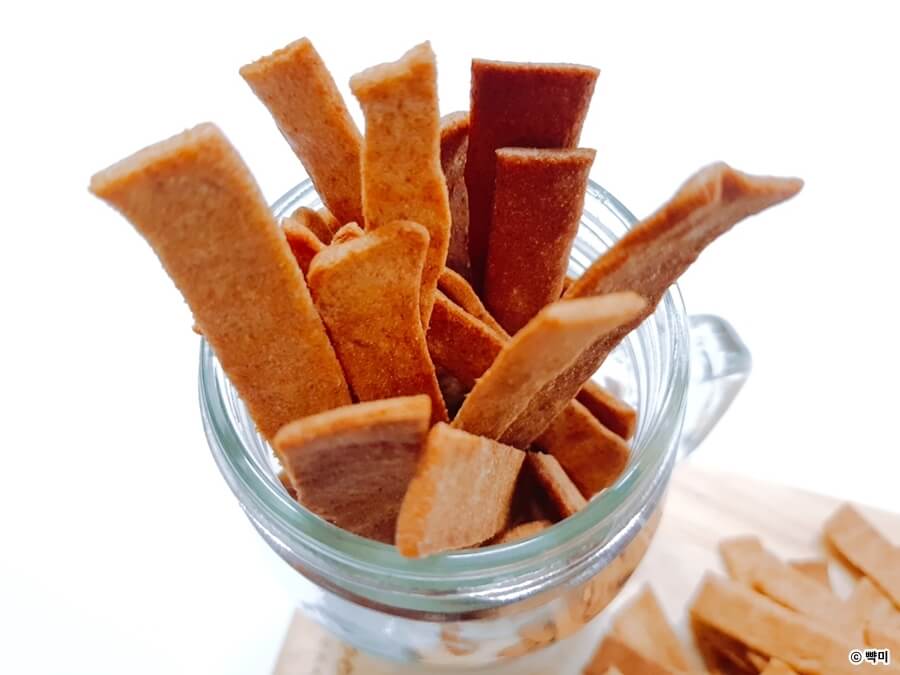 오븐에서 꺼낸 통밀 과자를 식힘망에 올려서 한김 식혔는데 얇게 밀어서 씬통밀스틱으로 만들었더니 위에 보이는 식힘망에 보이는 양이 두번 나왔습니다. 식감도 기대이상으로 바삭바삭 맛있게 완성되었습니다.