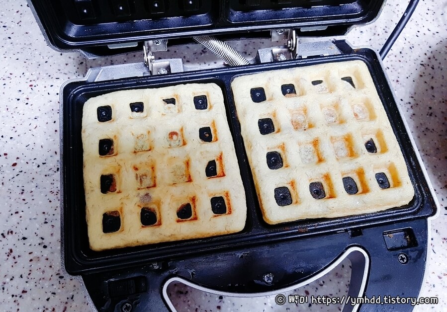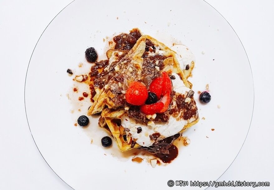 3. 완성된 코코넛 다이어트 와플을 접시에 담고 취향에 따라 과일이나 견과류 초코시럽 등을 뿌려주세요.
