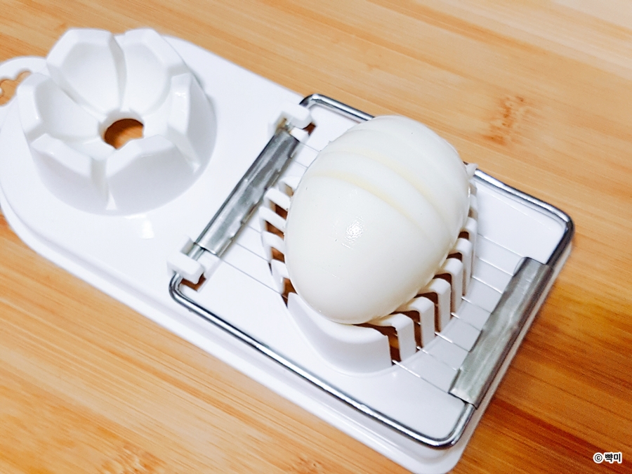 3. 쪄진 달걀은 껍질을 까준뒤 에그 슬라이서에 넣고 잘라주고 토마토는 얇게 썰어주세요.