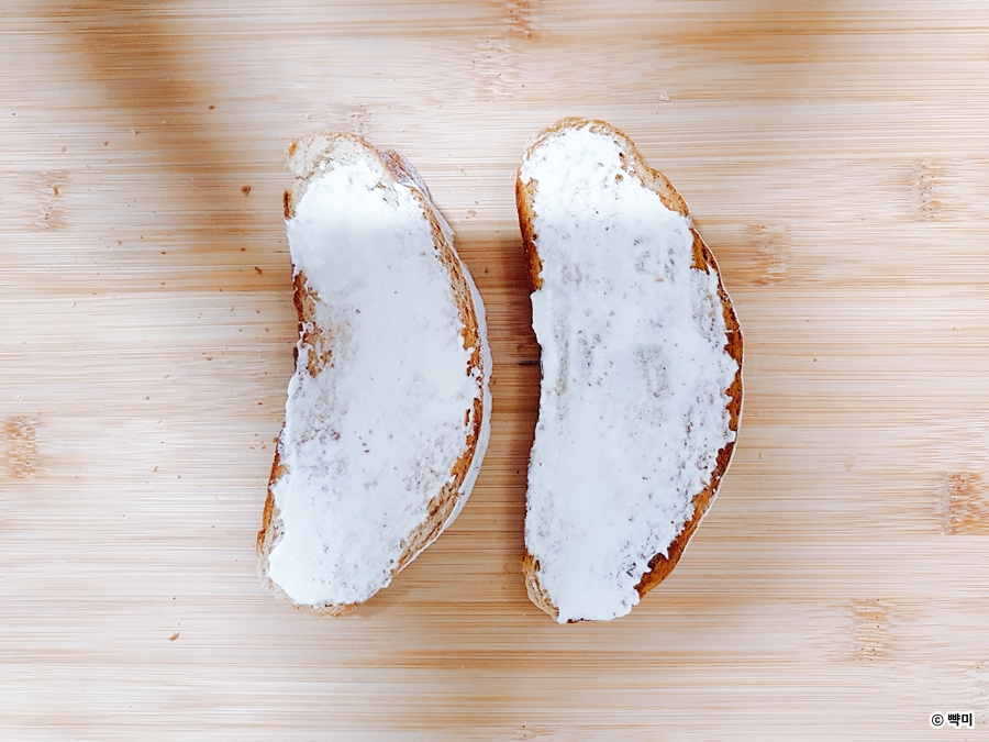 4. 통밀빵은 예열된 팬에 앞뒤로 각 30초씩 구워준 뒤 크림치즈를 얇게 펴 발라 주세요.