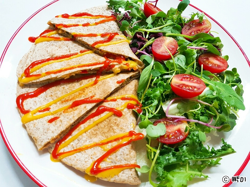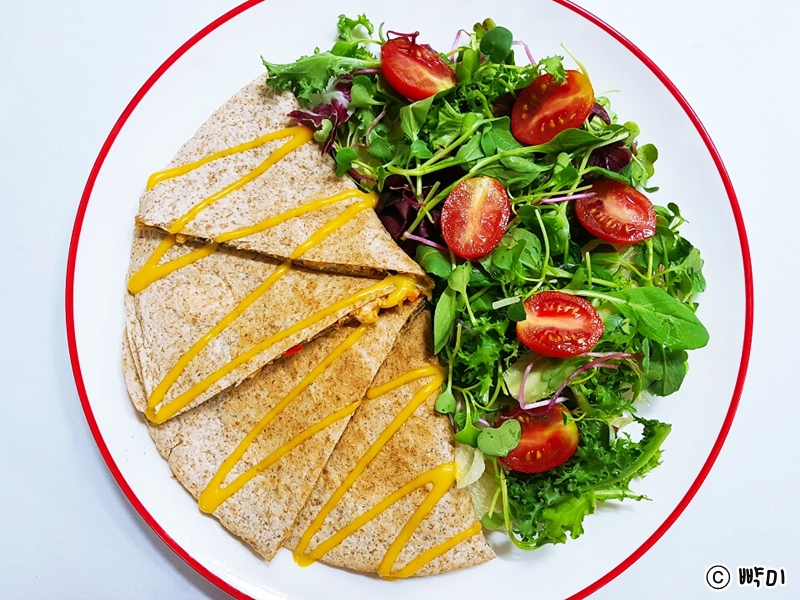 통밀또띠아 속에 야채와 닭안심살을 넣어서 만든 퀘사디아는 몸에 필요한 필수 영양소인 탄수화물과 단백질과 지방을 골고루 채워주어 다이어트 식단으로 든든하게 먹을 수 있답니다.