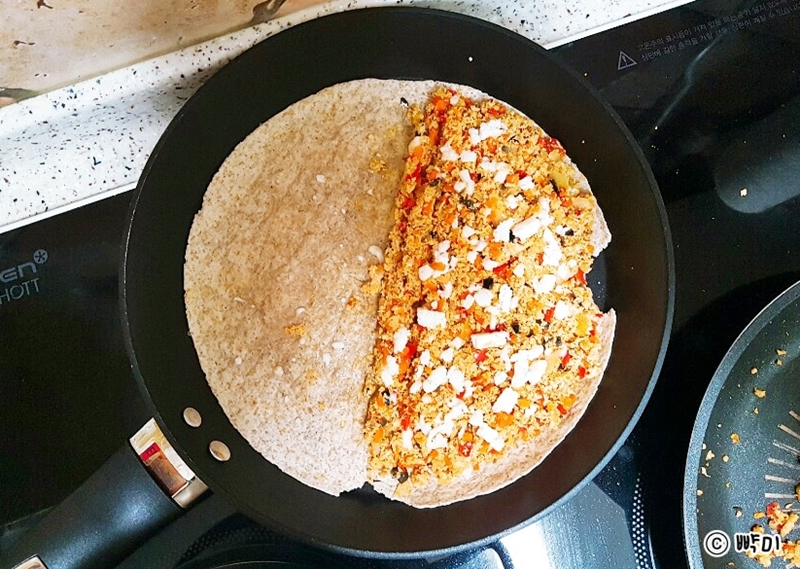 4. 예열해 놓은 다른 팬에 통밀 또띠아를 깔고 볶아 놓은 닭안심살야채 속을 또띠아의 절반 부분만 놓아주고 그 위에 모차렐라치즈를 올려준 후 반으로 접어 주세요.