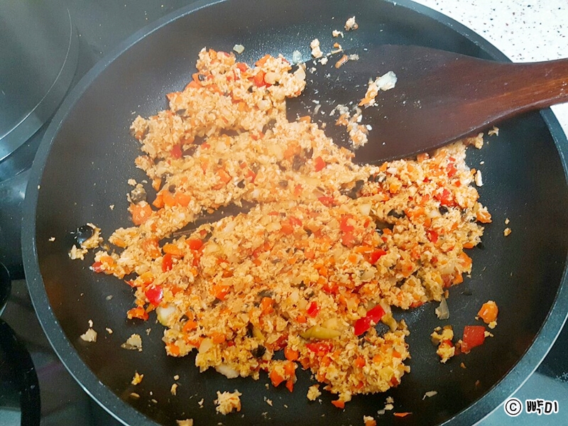 3. 예열된 팬에 코코넛오일을 두른 후 다진 야채와 닭안심살을 넣고 양파가 투명해질 때까지 중불로 볶다가 토마토소스, 스리라차소스, 후추를 뿌린 후 섞어서 살짝 볶아주세요.
